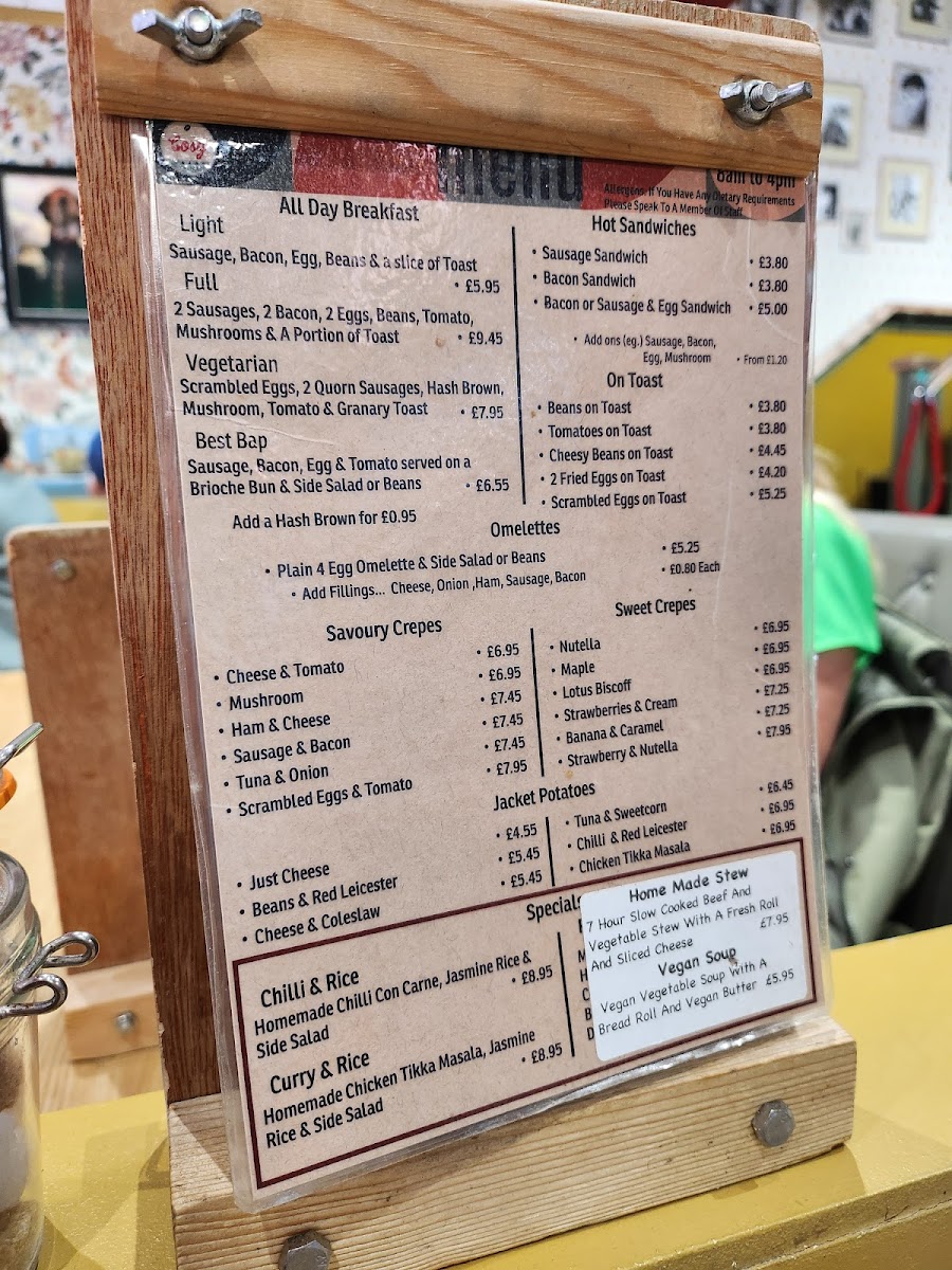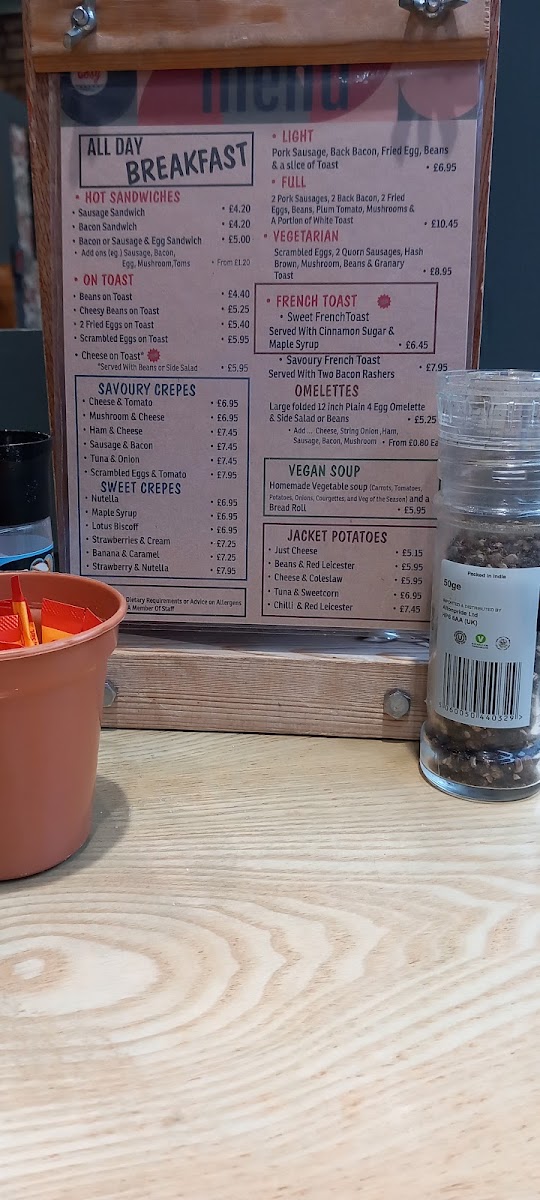 Start your day with a warm cappuccino or a smooth caramel latte, paired with a classic full English breakfast or a vegetarian alternative. Lunchtime choices range from hearty stews and French toast to savoury crepes filled with ham and cheese or tuna and onion. For something lighter or a touch of sweetness, the banana or Nutella crepes offer a pleasant finish.
